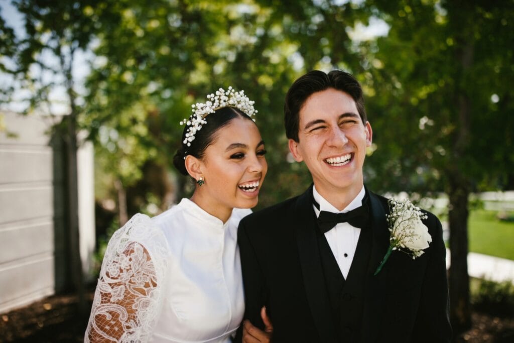 Joyful bride in lace gown with floral crown and groom in black tuxedo laughing outdoors among trees Gallery Image